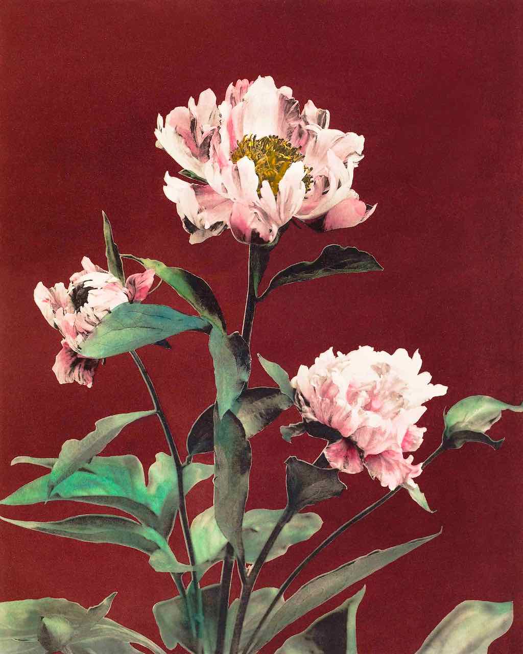 tags: botanical, flowers, leaves, drawings, vintage, pink, burgundy, floral, red background, pink peony, painting, vertical