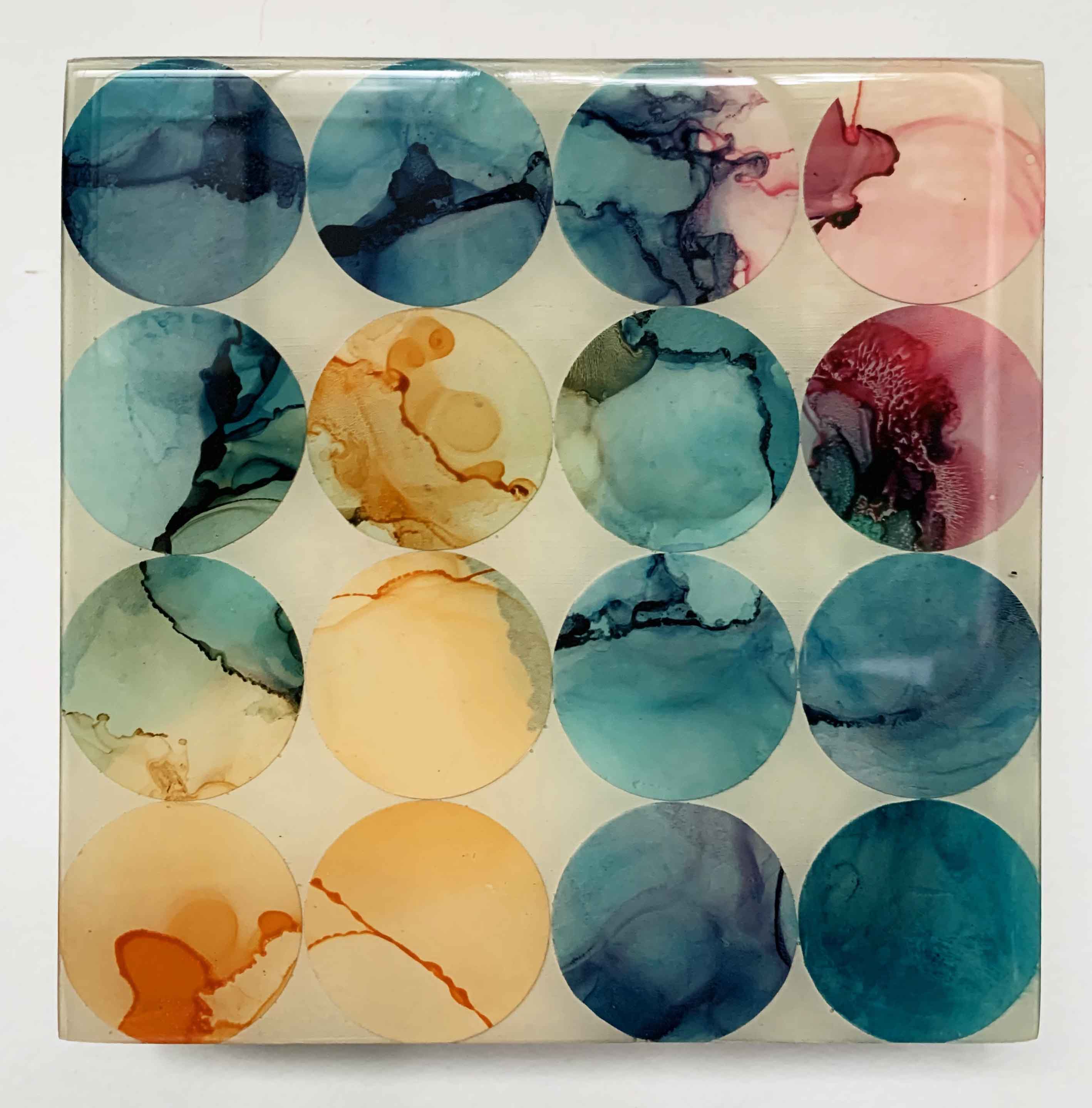 alcohol inks on yupo paper cut into shapes mounted on wood panel with resin coating