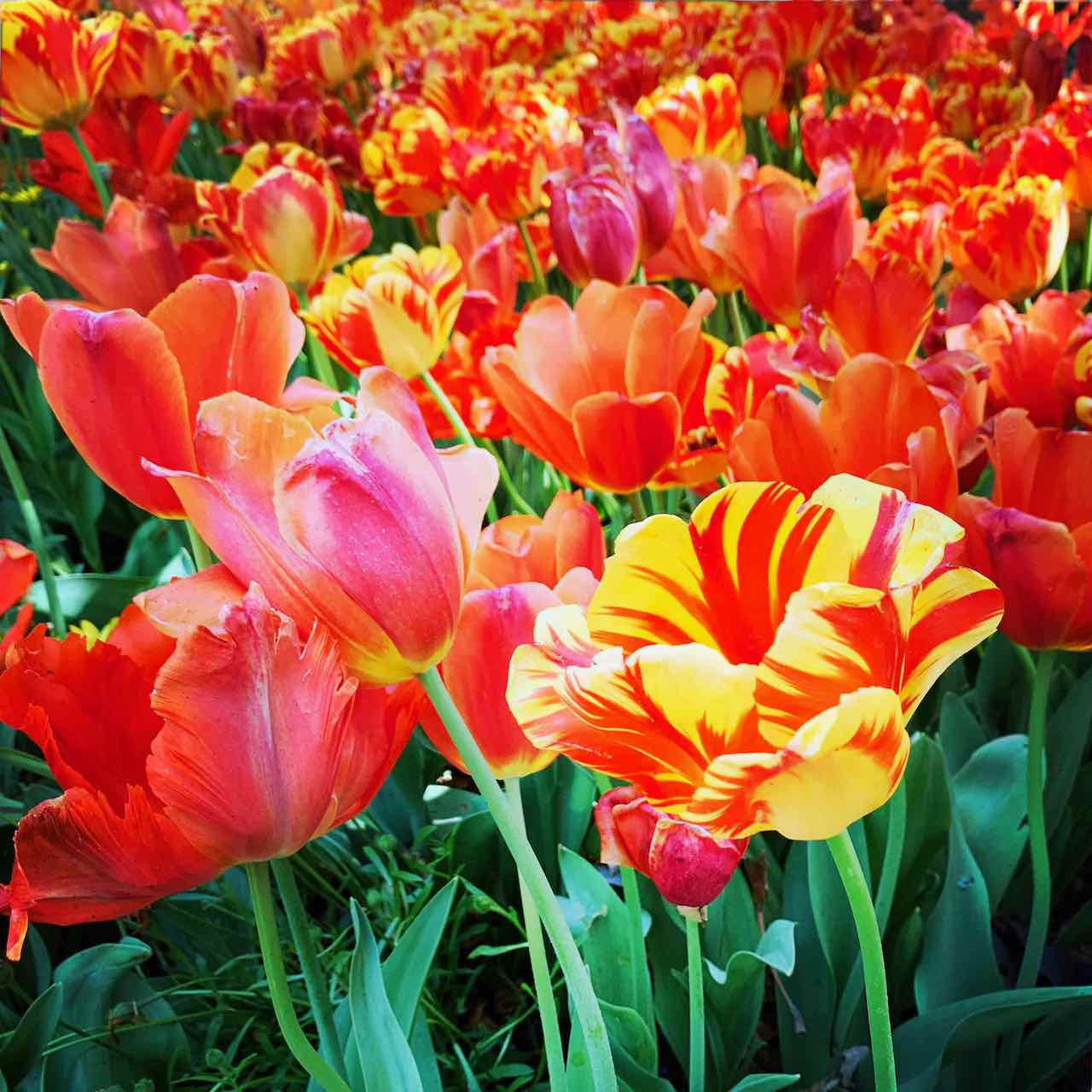 tags: photography, color photography, botanical, floral, leaves, green, red, yellow, coloful, contrast, red tulips, vivid, vibrant, square