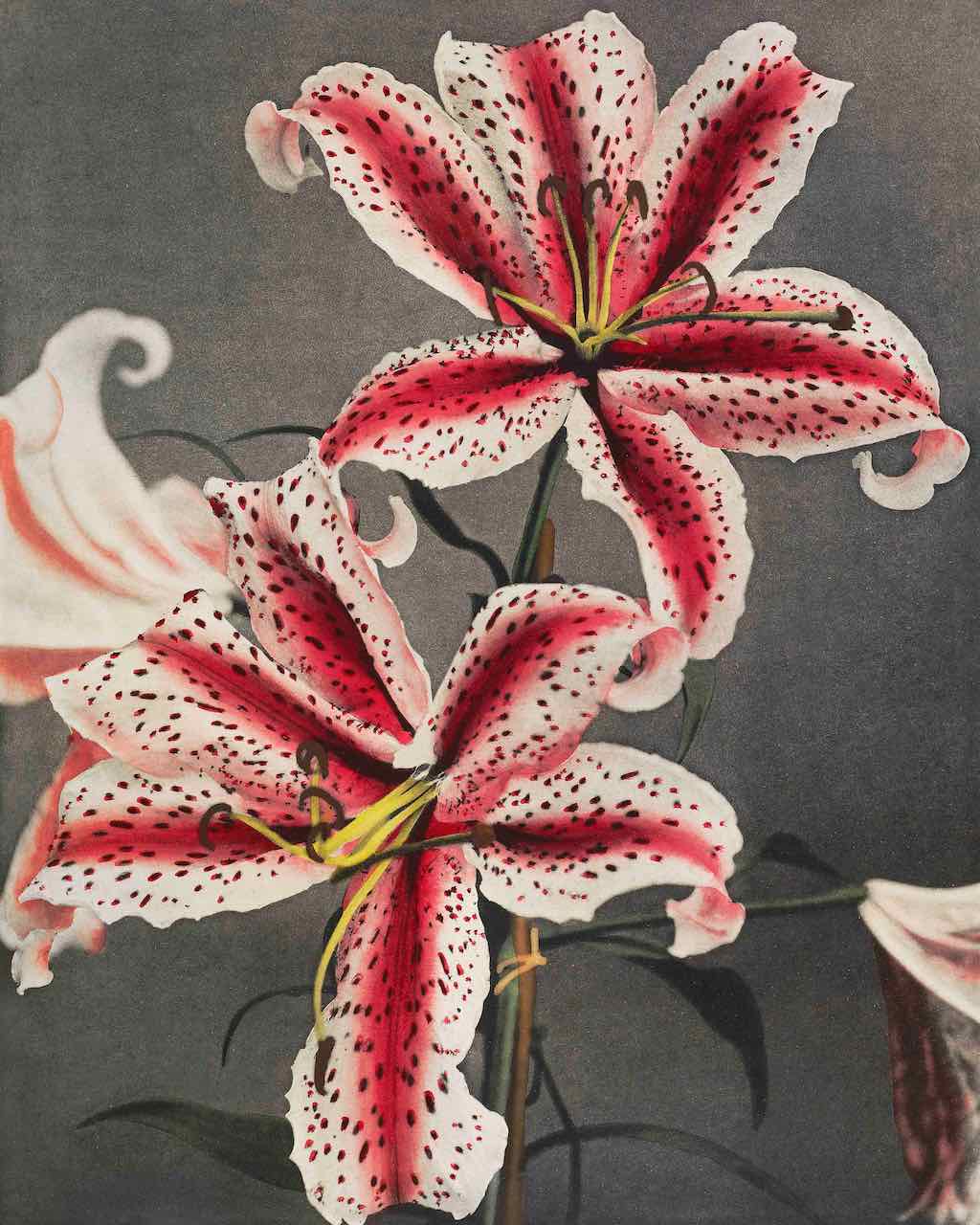 tags: botanical, flowers, leaves, drawings, vintage, red, white, floral, painting, red lilies, vertical
