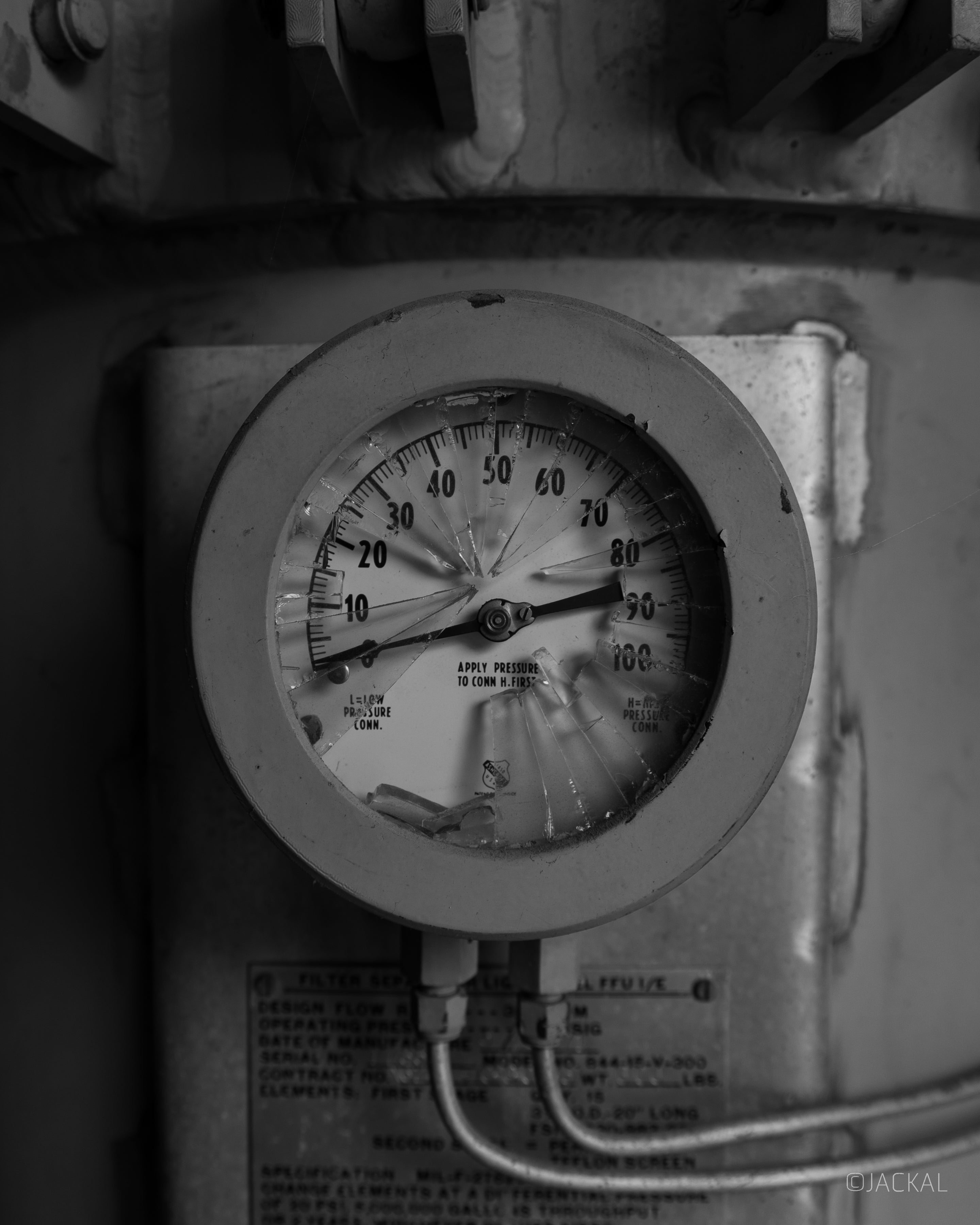 tags: photography, black & white photography, urban, industrial, pressure guage, broken