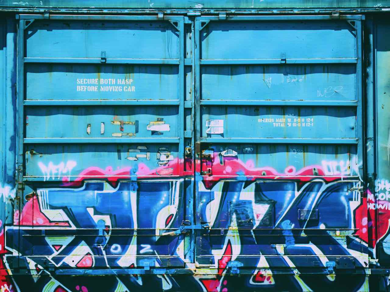 tags: photography, color photography, freight train, rust, graffiti, blue, multi-color